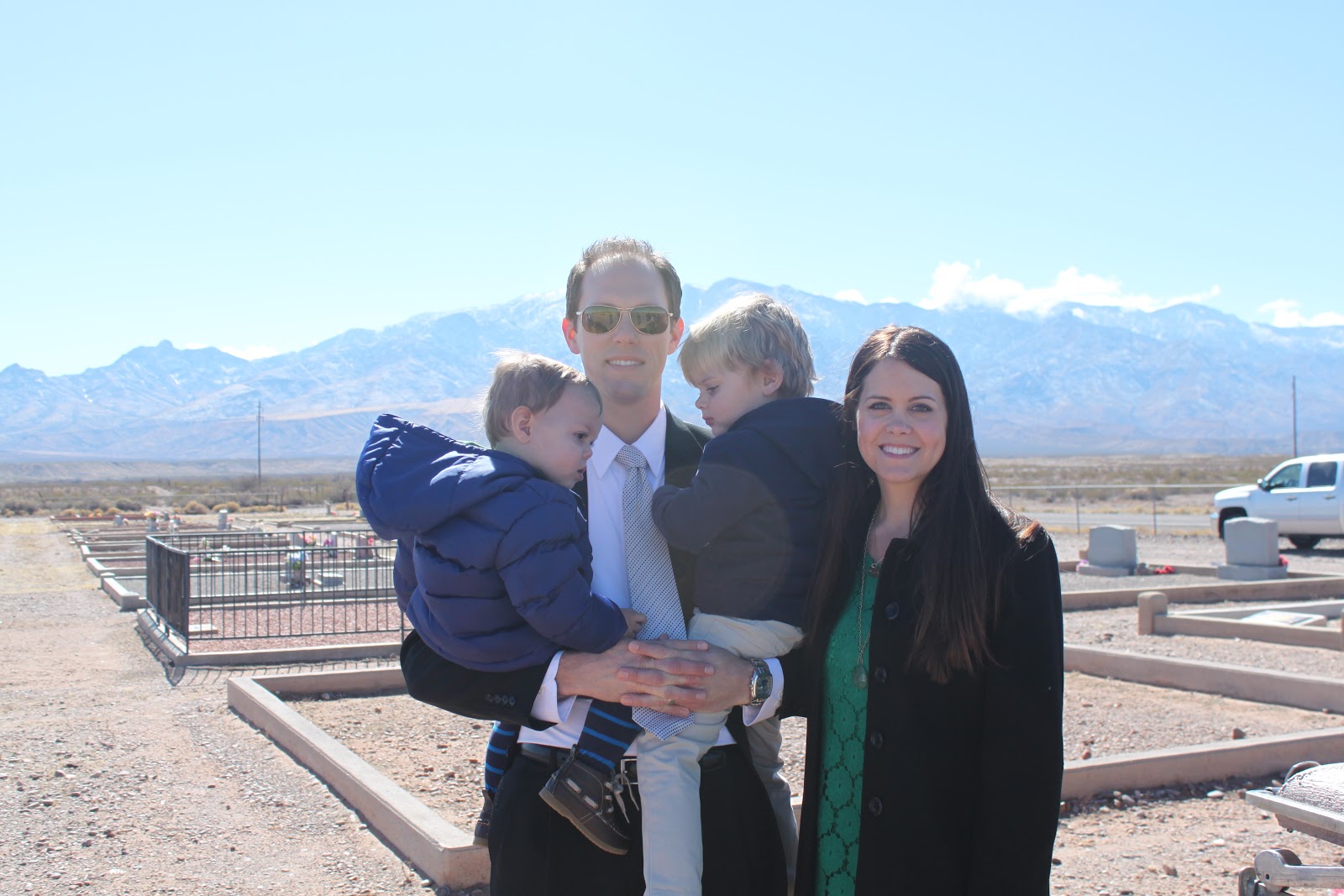 My grandma Weathersby was buried next to my sweet Grandpa up in Safford, AZ. The 3.5 hour drive was definitely an "eventful one." Hudson threw up his entire breakfast (luckily it was just green drink, so it wasn't too toxic smelling.) We didn't understand why the poor kid was crying and whining the first 40 minutes of our drive. Then he projectile vomited and we felt like the worst parents. We caravanned with my family, so we all pulled over at a rest stop to clean him and the car seat up.